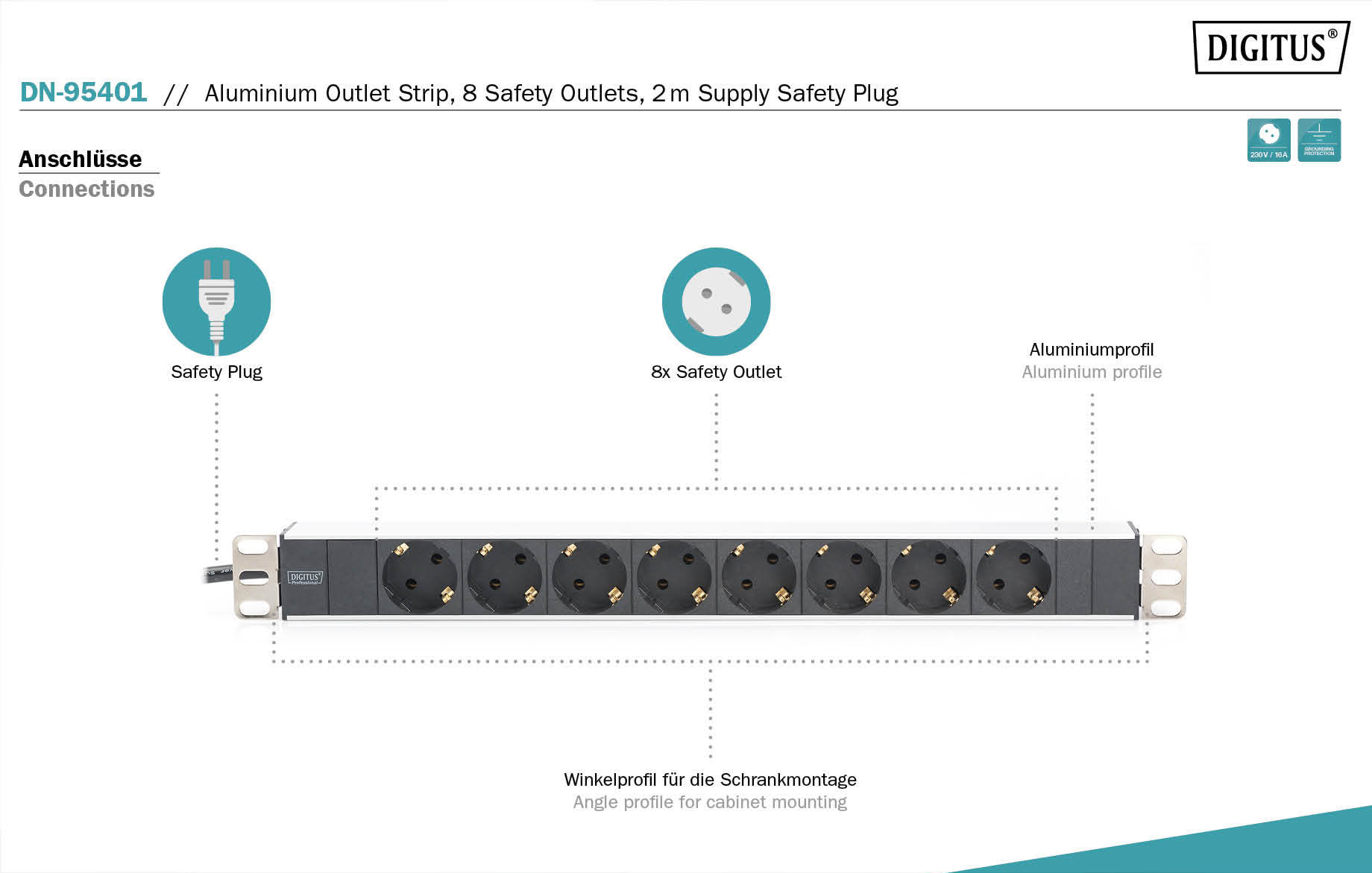 - 8x Schutzkontaktsteckdosen 250VAC 50/60Hz / 16A / 4000W
